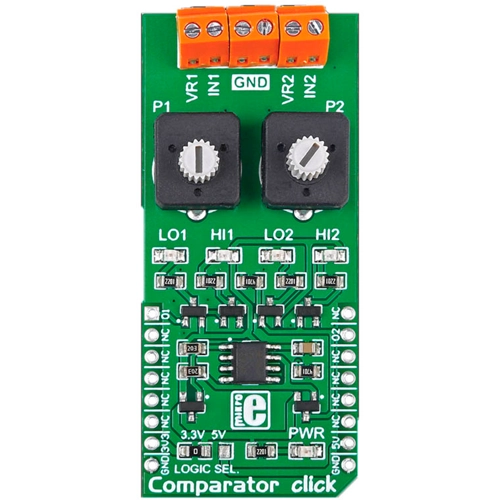 Interface: GPIO,Power Supply: 3.3V or 5V,On-board modules: LM2903 IC,Applications: A/D converters, Wide range VCO, MOS clock generator,Key Features: Two pairs of input screw terminals and two potentiometers, Range: 2-36 VDC (single power supply); ±1.0 VDC- ±18 VDC (dual power supply),Key Benefits: High precision: 2 mV offset voltage,Compatibility: mikroBUS,Product Type: Comparator,Click board size: L (57.15 x 25.4 mm)