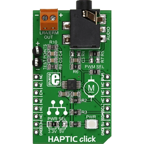 Interface: I2C,Power Supply: 3.3V or 5V,On-board modules: DRV2605, a Haptic Driver for ERM and LRA vibration motors,Applications: Enhancing User Interfaces with tactile feedback,Key Features: Audio jack for audio-to-vibe effects. Integrates library with over 100 haptic effects. Screw terminals for connecting ERM and LRA motors,Key Benefits: Several jumpers for hardware configuration. Includes licensed TouchSense® 2200 effects from Immersion™,Compatibility: mikroBUS,Product Type: DC,Click board size: M (42.9 x 25.4 mm)