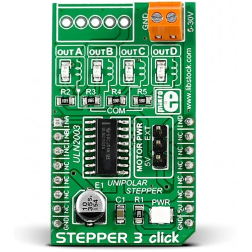 Interface: PWM,Power Supply: 5V,On-board modules: Texas Instruments ULN2003 High-Current Darlington transistor array,Applications: Board step motors in full-, half-, quarter-, eighth- and sixteenth-step modes,Key Features: Connector for external power supply up to 30V,Key Benefits: Precise motor control: individual phases can be accessed separately,Compatibility: mikroBUS,Product Type: Stepper,Click board size: M (42.9 x 25.4 mm)