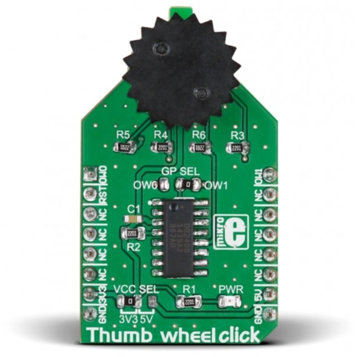 Interface: 1-wire,Power Supply: 3.3V or 5V,On-board modules: DS2408 8-channel addressable switch,Applications: Used as a simple input device on a variety of instruments, machines, and similar devices,Key Features: 1-Wire 8-Channel 10-position thumbwheel switch,Key Benefits: Configurable output pin (OW1 or OW2), Starting point marked with notch on PCB for easier orientation,Compatibility: mikroBUS,Product Type: Rotary encoder,Click board size: M (42.9 x 25.4 mm)