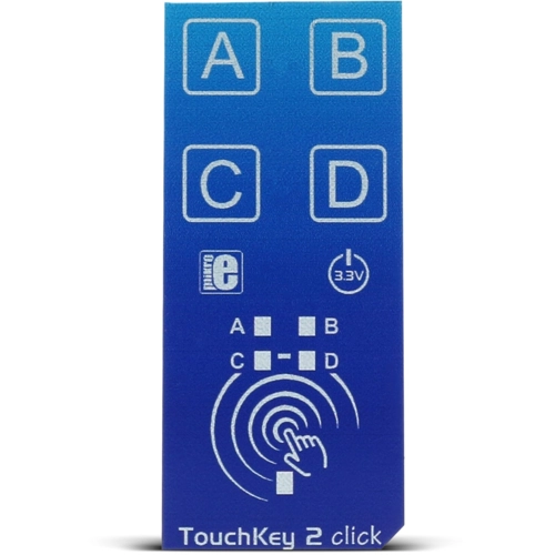 Product Type Capacitive, Applications A replacement for mechanical buttons, On-board modules ATtiny817 from Microchip, Key Features Four capacitive touch pads, 3.3V power supply, protective plastic overlay, Key Benefits High moisture tolerance, Interface UART, (SPI is optional), Power Supply 3.3V, Compatibility mikroBUS, Click board size L (57.15 x 25.4 mm)