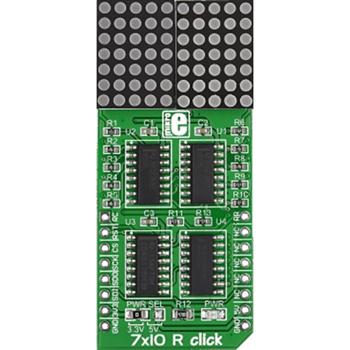 Interface: SPI,Power Supply: 3.3V or 5V,On-board modules: Matrix of 70 red LEDs driven by a pairs of 8-bit serial-in, parallel-out shift registers, a Darlington Transistor array and a Johnson counter,Applications: 7x5 dot matrix text display for user interfaces, for example on vending machines,Key Features: SPI interface (plus MR#, LATCH and R RST pins),Key Benefits: Displays letters in highly readable format. Scrolling text capability,Compatibility: mikroBUS,Product Type: LED Matrix,Click board size: L (57.15 x 25.4 mm)