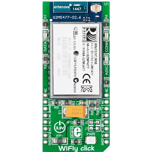 Interface: UART,Power Supply: 3.3V,On-board modules: RN-131 embedded wireless LAN module,Applications: Easily connect to wireless networks for IoT, telemetry, remote equipment monitoring, data logging,Key Features: Qualified 2.4-GHz IEEE 802.11 b/g transceiver. Onboard ceramic chip antenna and connector for external antenna,Key Benefits: Preloaded firmware simplifies integration. Controlled through ASCII commands,Compatibility: mikroBUS,Product Type: Wi-Fi,Click board size: L (57.15 x 25.4 mm)