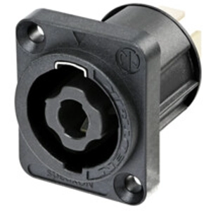 4 pole male chassis connector for 30 A rms continuous. Black D-size flange, countersunk thru holes, 1/4" flat tabs. This connector is fully compliant to the device standard IEC 62368-1, due to its component certification according to IEC 61984. The speakON panel mount connector is the standard chassis connector for loudspeaker/amplifier interconnection. It features a unique metal locking system, making contact only once fully locked. The speakON receptacle is robust, versatile, and easy to terminate.