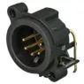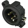 3 pole male XLR receptacle, grounding: ground contact connected to shell ground, but not to front panel and Pin 1, lateral right PCB mount. The 'State of the Art' receptacle. Round plastic body XLR PCB mount panel connector. These have the smallest size and highest packing density (23 mm between centres). New designed fork type contacts with hard gold plating and polished contact areas. UL recognized component.