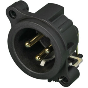 5 pole male XLR receptacle, switching contacts, grounding: separate ground contact to mating connector shell and front panel, vertical PCB mount, color coding possible.