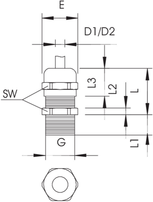 Cable gland of cap-nut design with large sealing area, strain relief and torsion protection for high sealing demands with long Pg connection. Thread to DIN 40430, for thicker housing wall thicknesses in connection with locknut.