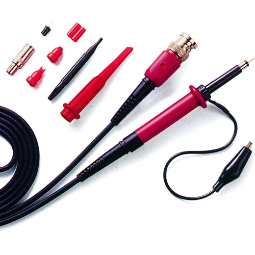 Universal oscilloscope probe for any commercial oscilloscope. On the side of the probe is a crocodile clip as a ground connection. The outer BNC connector is made of metal and thus has ground contact. At the top of this probe has a metal contact for connection to the test voltage. In addition, the probe also includes a cable clamp to provide a permanent connection to the pin or cable to be measured.