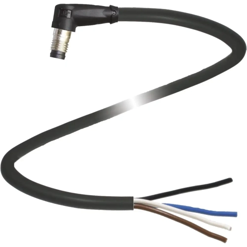 Male cordset single-ended M8 snap-lock angled A-coded, 4-pin, PUR cable black, UL-approved, drag chain suitable, torsion resistant.