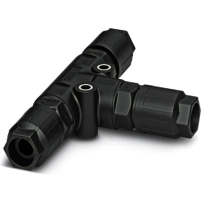 T distributor, QUICKON connection, Number of positions: 3+PE, 1-2.5 mm², 690 V, 20 A, black, With three QUICKON nuts, External cable diameter: 9-14 mm