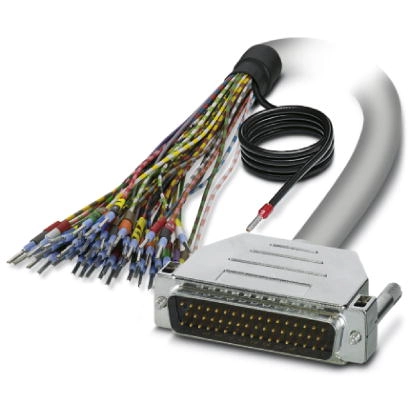 Assembled shielded round cable, Connection 1: Single wires (50-positions). The wires are marked and fitted with ferrules. The braided shield is routed to a separate cable end. Connection 2: D-SUB pin strip (1x 50-positions); cable length: 0.5 m.