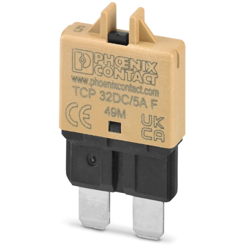 1-channel thermal device circuit breaker for protecting loads up to 32 V DC in the event of an overload. Fuse type: fast-acting. Can be plugged onto fuse terminal blocks and interfaces for flat plug-in fuse of type C according to standard ISO 8820-3. With fixed nominal current: 5 A.