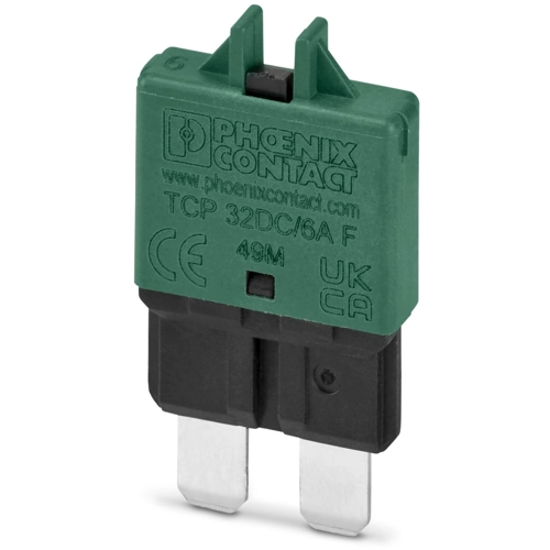 1-channel thermal device circuit breaker for protecting loads up to 32 V DC in the event of an overload. Fuse type: fast-acting. Can be plugged onto fuse terminal blocks and interfaces for flat plug-in fuse of type C according to standard ISO 8820-3. With fixed nominal current: 6 A.