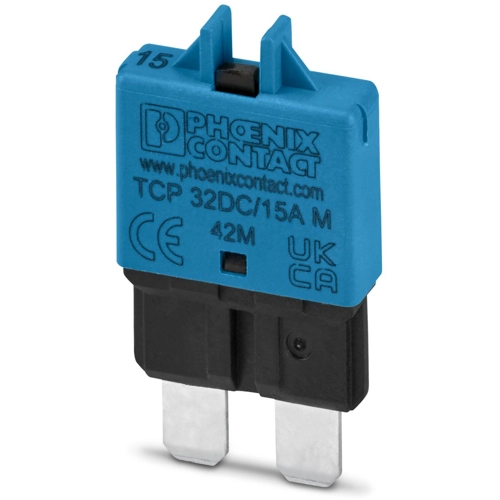 1-channel thermal device circuit breaker for protecting loads up to 32 V DC in the event of an overload. Fuse type: slow-blow. Can be plugged onto fuse terminal blocks and interfaces for flat plug-in fuse of type C according to standard ISO 8820-3. With fixed nominal current: 15 A.