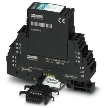 Surge protection, consisting of protective plug and base element, with integrated multi-stage status indicator on the module for five signal wires. For HF applications and telecommunications interfaces without supply voltage (up to 90 Mbps).