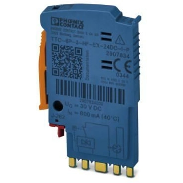 Surge protection plug with integrated status indicator for a 3-wire Ex i signal circuit with common reference potential. For HF applications. Nominal voltage: 24 V DC.