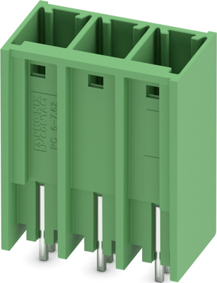 PCB headers, nominal cross section: 6 mm², color: green, nominal current: 41 A, rated voltage (III/2): 630 V, contact surface: Sn, contact connection type: Pin, number of potentials: 3, number of rows: 1, number of positions: 3, number of connections: 3, product range: PCV 6/..-G, pitch: 7.62 mm, mounting: Wave soldering, pin layout: Linear pinning, solder pin [P]: 2.6 mm, number of solder pins per potential: 3, plug-in system: COMBICON PC 6, Pin connector pattern alignment: Standard, locking: without, mounting method: without, type of packaging: packed in cardboard.