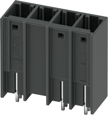 PCB headers, nominal cross section: 6 mm², color: black, nominal current: 41 A, rated voltage (III/2): 630 V, contact surface: Sn, contact connection type: Pin, number of rows: 1, number of positions: 3, product range: PCV 6/..-GL-THR, pitch: 7.62 mm, mounting: THR soldering / wave soldering, pin layout: Linear pinning, solder pin [P]: 2.6 mm, number of solder pins per potential: 3, plug-in system: COMBICON PC 6, Pin connector pattern alignment: Standard, locking: Snap-in locking, mounting method: Latching flange, type of packaging: packed in cardboard.