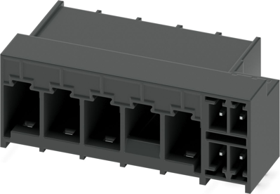 PCB hybrid header, nominal cross section: 6 mm², color: black, nominal current: 41 A, 8 A, rated voltage (III/2): 630 V, contact surface: Sn, contact connection type: Pin, number of rows: 1, number of positions: 8, product range: PCH 6/..+4-GL-THR, pitch: 7.62 mm, mounting: THR soldering / wave soldering, pin layout: Linear pinning, solder pin [P]: 2.6 mm, number of solder pins per potential: 3, plug-in system: COMBICON PC 6 hybrid, Pin connector pattern alignment: Standard, locking: Snap-in locking, mounting method: Latching flange, type of packaging: packed in cardboard.
