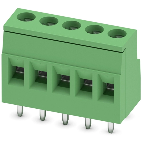 PCB terminal block, nominal current: 24 A, rated voltage (III/2): 400 V, nominal cross section: 2.5 mm², number of potentials: 5, number of rows: 1, number of positions per row: 5, pitch: 5.08 mm, connection method: screw connection with tension sleeve, screw head form: L slotted, conductor/PCB connection direction: 0 °, color: green, pin layout: linear double pinning, solder pin: 3.7 mm, number of solder pins per potential: 2.