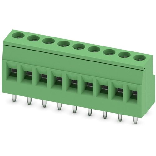 PCB terminal block, nominal current: 24 A, rated voltage (III/2): 400 V, nominal cross section: 2.5 mm², number of potentials: 9, number of rows: 1, number of positions per row: 9, pitch: 5.08 mm, connection method: screw connection with tension sleeve, screw head form: L slotted, conductor/PCB connection direction: 0 °, color: green, pin layout: linear double pinning, solder pin: 3.7 mm, number of solder pins per potential: 2.