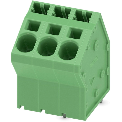 PCB terminal block, nominal current: 41 A, rated voltage (III/2): 1000 V, nominal cross section: 6 mm², number of potentials: 3, number of rows: 1, number of positions per row: 3, pitch: 7.5 mm, connection method: push-in spring connection, conductor/PCB connection direction: 30 °, color: green, pin layout: linear double pinning, solder pin: 4.6 mm.