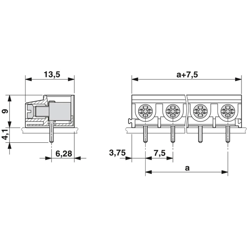 PCB terminal block, nominal current: 32 A, rated voltage (III/2): 800 V, nominal cross section: 2.5 mm², number of potentials: 14, number of rows: 1, number of positions per row: 14, pitch: 7.5 mm, connection method: screw connection with wire protector, conductor/PCB connection direction: 90 °, color: green, pin layout: linear pinning, solder pin: 4.1 mm, number of solder pins per potential: 1.