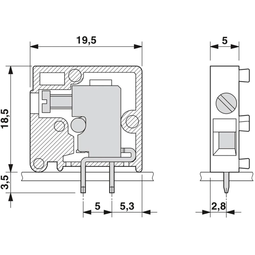 PCB terminal block, nominal current: 24 A, rated voltage (III/2): 400 V, nominal cross section: 2.5 mm², number of potentials: 7, number of rows: 1, number of positions per row: 7, pitch: 5 mm, connection method: front screw connection, conductor/PCB connection direction: 0 °, color: green, pin layout: linear double pinning, solder pin: 3.5 mm, number of solder pins per potential: 2.