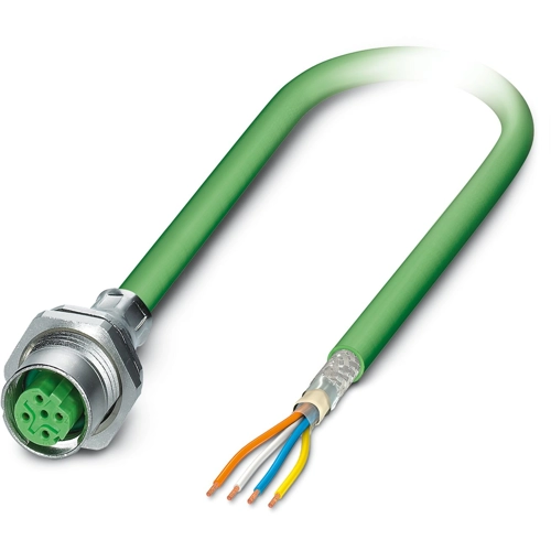 Device connector rear mounting, PROFINET CAT5 (100 Mbps), EtherCAT® CAT5 (100 Mbps), 4-position, Socket, straight, M12-SPEEDCON, D-coding, on free cable end, Cable connection, cable length: 0.5 m.