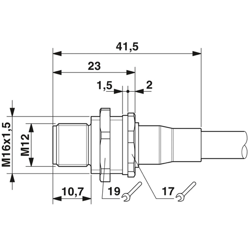 Flush-type plug, Shielded, 17-position, M12, A-coded, Rear/screw mounting with M16 thread, with 2 m cable, 17 x 0.14 mm²