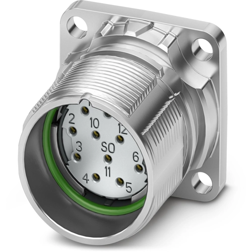 M23, Device connector front mounting, series: M23 PRO, straight, shielded: yes, for standard and ONECLICK fast locking system, No. of pos.: 12, Direction of rotation: Standard, contact connection type: Socket, Solder connection, 4x Ø 3.2, flange dimensions: 28 mm x 28 mm, coding: N, Item is lead-free in accordance with RoHS II without Exemption 6c (Pb < 0.1 %).