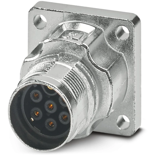 M17, Device connector front mounting, series: M17 PRO, straight, shielded: yes, for standard and ONECLICK fast locking system, No. of pos.: 6+PE, Direction of rotation: Standard, contact connection type: Socket, Crimp connection, flange dimensions: 26 mm x 26 mm, coding: N, Item is lead-free in accordance with RoHS II without Exemption 6c (Pb < 0.1 %).