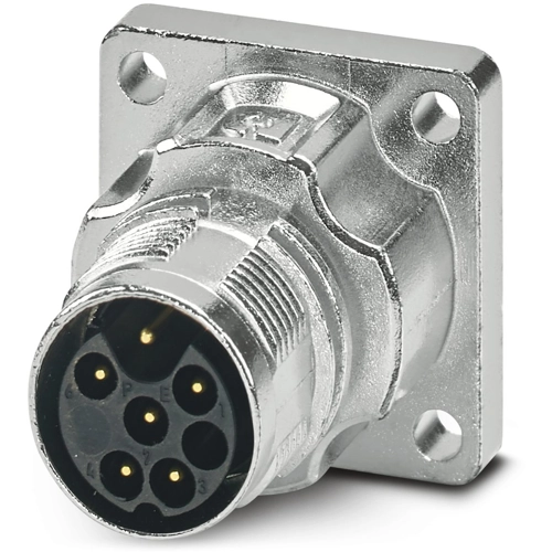 M17, Device connector front mounting, series: M17 PRO, straight, shielded: yes, for standard and ONECLICK fast locking system, No. of pos.: 5+PE, Direction of rotation: Standard, contact connection type: Pin, Crimp connection, flange dimensions: 26 mm x 26 mm, coding: N, Item is lead-free in accordance with RoHS II without Exemption 6c (Pb < 0.1 %).