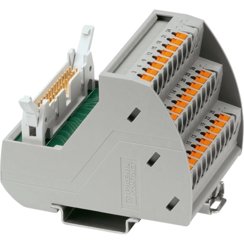 VARIOFACE module, with push-in connection and flat-ribbon cable connector, for mounting on NS 35 DIN rails, with pin strip plus short and long locking latches for socket strips, 26-positions.