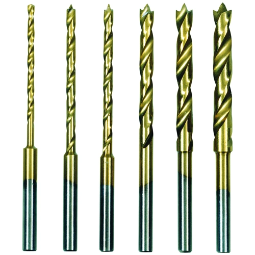 6-piece set for precision tapping of wood and plastics; also non-ferrous metal, steel and stainless steel sheets. Titanium coating reduces friction and increases service life.