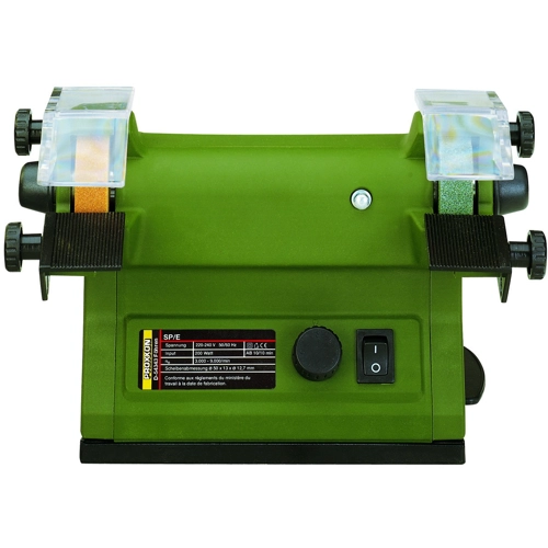 The slim housing facilitates the grinding of long workpieces and includes an adapter to connect a vacuum cleaner to the unit. The tool rests and eye guards are both adjustable. A spindle lock eases the changing of wheels and discs. Supplied with a 50 x 13 mm corundum (grade N) and silicon carbide (soft compound) wheel for general grinding/sharpening and hard materials respectively.