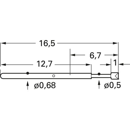 Standard spring contact with probe, round head, Ø 0.49 mm, travel 2.8 mm, pitch 1.27 mm, L 16.5 mm, 1007-B-0.7N-AU-0.49 C