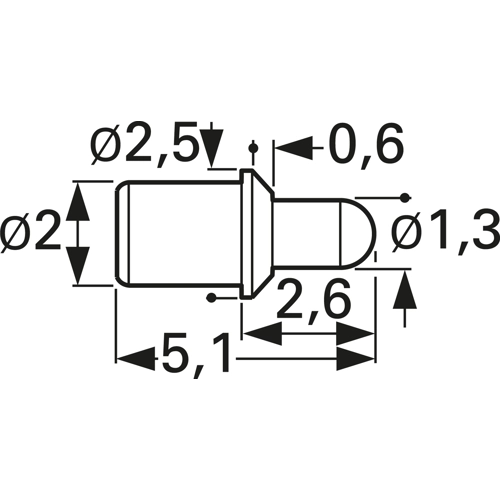 Battery charge and interface contact with probe, round head, Ø 1.3 mm, travel 1.2 mm, pitch 3 mm, L 5.1 mm, 5099-D-2.0N-AU-1.3 C