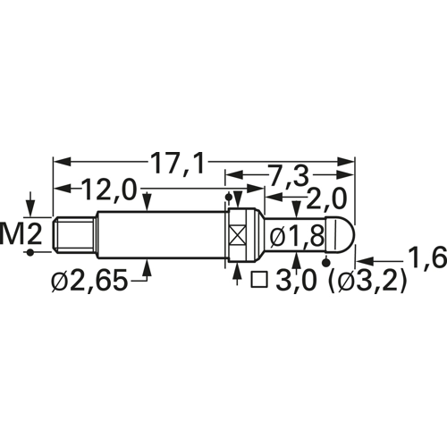 Thread test pin with probe, flathead, Ø 2.3 mm, travel 3.5 mm, pitch 4 mm, L 22.5 mm, 5110/G-F-1.2NE-AU-2.3 C