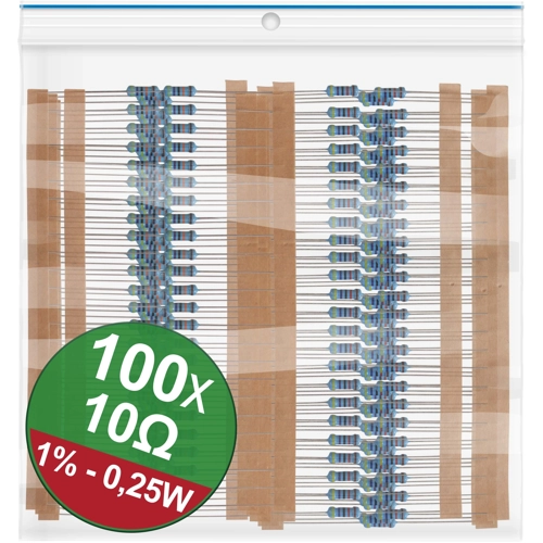 Metal film resistor, 10 Ω, 0.25 W, ±1 %, Bag with 100 pieces, 22P039, package with 100 pieces
