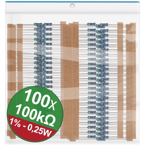 Metal film resistor, 100 kΩ, 0.25 W, ±1 %, Bag with 100 pieces, 22P054, package with 100 pieces