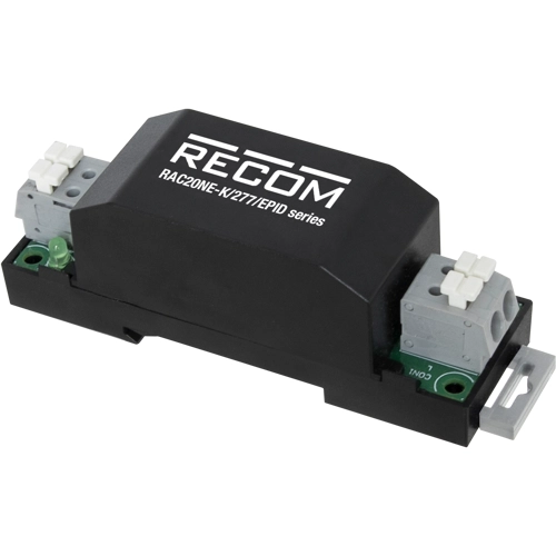 The RAC20NE-12SK/277/EPID power supply is designed to flexibly fit into different mounting conditions, whether back panel mounting with screws or clipping onto DIN rails is required. In addition to the push-in terminals for tool-free connection of wire cross-sections up to 2.5mm², the module is IP40 ingress protected. Despite its extremely compact design, the class II unit offers increased resistance to surges up to 2kV L-N and 4kV to earth, as well as EMI-interference filters to meet EN55032 Class “B” requirements under floating or earth-coupling load conditions such as PELV. The unit is fully certified to safety standards UL/IEC/EN62368, IEC61347, IEC61558, and EN60335 with overvoltage category OVC III for worldwide nominal input voltages of 100-277VAC. It operates at full load from -40°C to 55°C, with power limitation up to 85°C.