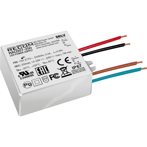 The RACD07-350 is a constant current 7W AC/DC source for LED lighting with a wide input voltage range. It is IP67 rated and suitable for use in dry, damp or wet areas.
