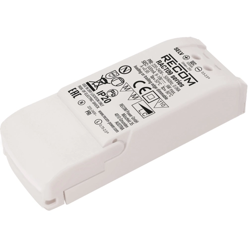 The RACT09-700 is a low cost, triac-dimmable, constant current 9W LED driver available with either 350mA, 500mA or 700mA full-range outputs. The driver is Class II (double insulated) meaning no earth connection is required. The phase angle dimming works with leading or trailing edge dimmers. The RACT09 is suitable for indoor locations up to 50°C ambient temperature and is certified for building into furniture for applications such as dimmable shelf lighting, cove lighting or accent lighting.