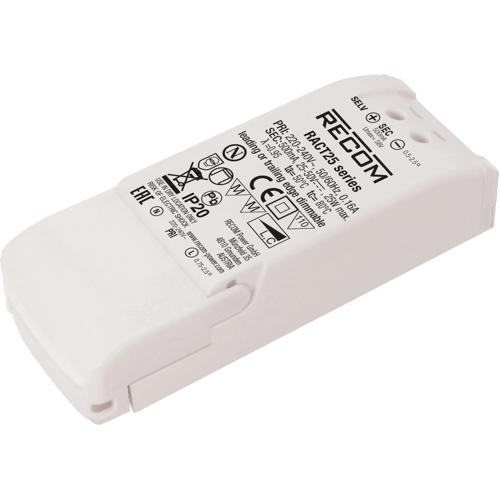 The RACT25-500 is a low cost, triac-dimmable, constant current 9W LED driver available with either 350mA, 500mA or 700mA full-range outputs. The driver is Class II (double insulated) meaning no earth connection is required. The phase angle dimming works with leading or trailing edge dimmers. The RACT09 is suitable for indoor locations up to 50°C ambient temperature and is certified for building into furniture for applications such as dimmable shelf lighting, cove lighting or accent lighting.