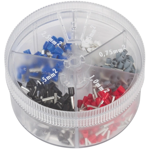 Insulated wire end ferrules in assortment box 0.5 - 2.5 mm², supplementary products for our wire end ferrule pliers, transparent handy plastic box, rotating lid with opening for removing individual wire end ferrules, defined fitting with insulated and uninsulated wire end ferrules, insulated wire end ferrules exclusively according to DIN colour code, 0.5 mm², 0.75 mm², 1.0 mm², 1.5 mm², 2.5 mm², made in Germany