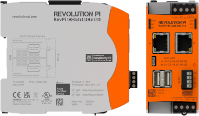 The RevPi Connect SE allows the user maximum freedom of design during the implementation of IIoT projects due to the open platform concept (e. g. complete root rights). Two Ethernet sockets enable the device to be simultaneously connected to the automation network and IT network, for example, to transmit machine data from the shop floor to the cloud or a higher-level IT system.