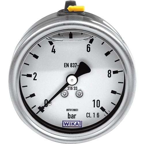 Glycerine pressure gauge CrNi steel design, Connection, rear, centric, G 1/4, Goods class 1.6, Measurement range 0 - 4 bar, Ø 63. Glycerine-filled bourdon-tube pressure gauge, CrNi steel type. For use in the chemical/petrochemical process industry, power stations, machinery and industrial plant engineering. For measurements in areas with high, dynamic pressure loads and vibration levels. Suitable for gaseous and liquid, corrosive, not highly viscous and non-crystallizing media, also in corrosive atmosphere.