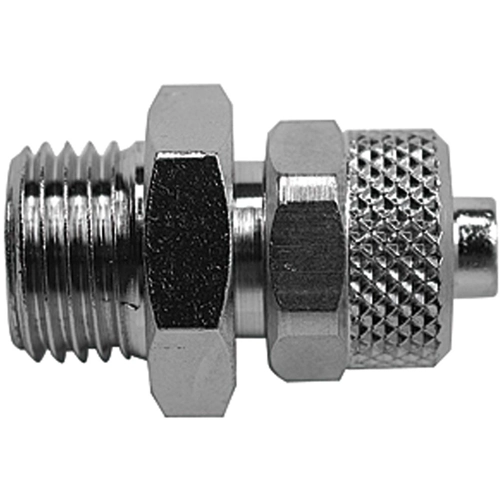 Straight screw-in fitting, without O-ring, G 1/8 o., for hose 5/3 mm, AF 14, Working pressure max. 18 bar, nickel-plated brass.