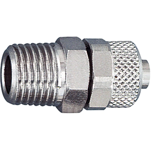 Straight screw-in fitting, ET conical, R 3/8, for hose 10/8 mm, AF 17, Working pressure max. 18 bar, nickel-plated brass.